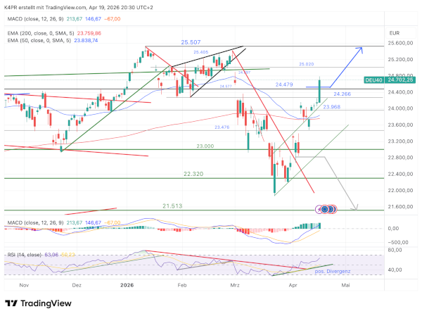 Für den Wochenstart sind das keine guten Voraussetzungen. Die geopolitische Lage bleibt angespannt und könnte den DAX erneut unter Druck setzen. Aus technischer Sicht gibt es allerdings auch positive Signale: Mit dem Anstieg über 24.480 Punkte wurde ein Kaufsignal ausgelöst. Mögliche nächste Ziele liegen bei 25.020 und 25.507 Punkten, weshalb eine Long-Position eröffnet wurde.
