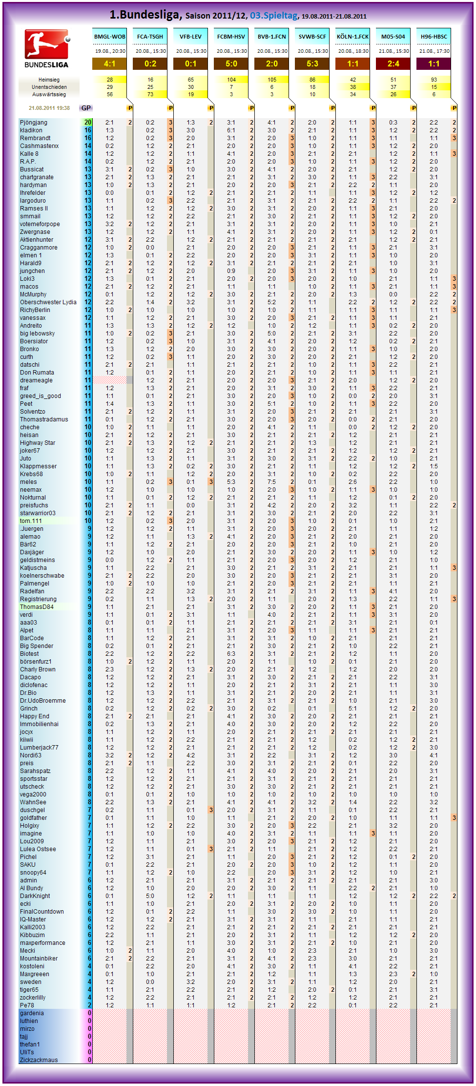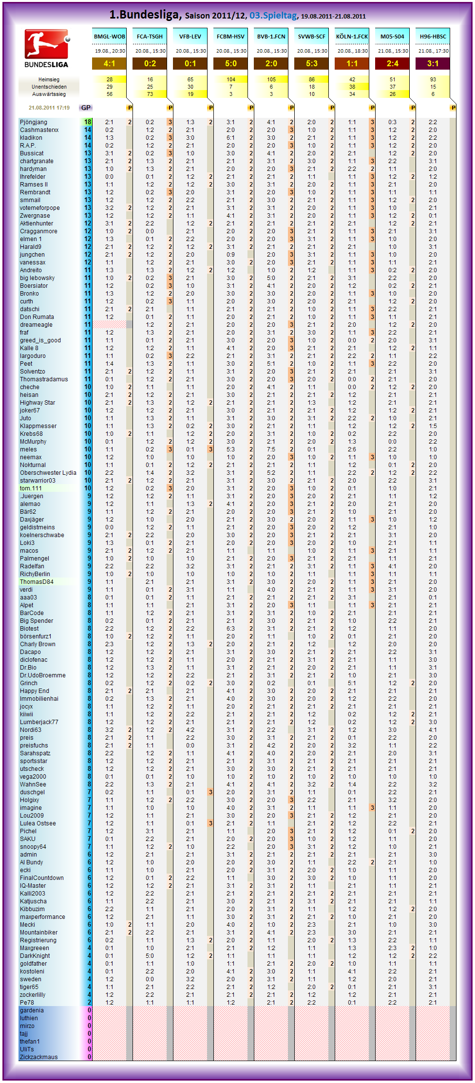 Allgemein, bei Unentschieden gehts total eng zu in der Tagessiegerwertung, dann bibbern fast 10 Spieler um den Tagessieg bei H96-HBSC, naja, nicht exakt ganz soviele, aber das endet heute wie ein Western.. Duelle um Duelle um den Tagessieg.... Darf halt bloß nicht mehr soviel in mainz passieren.. ;o))