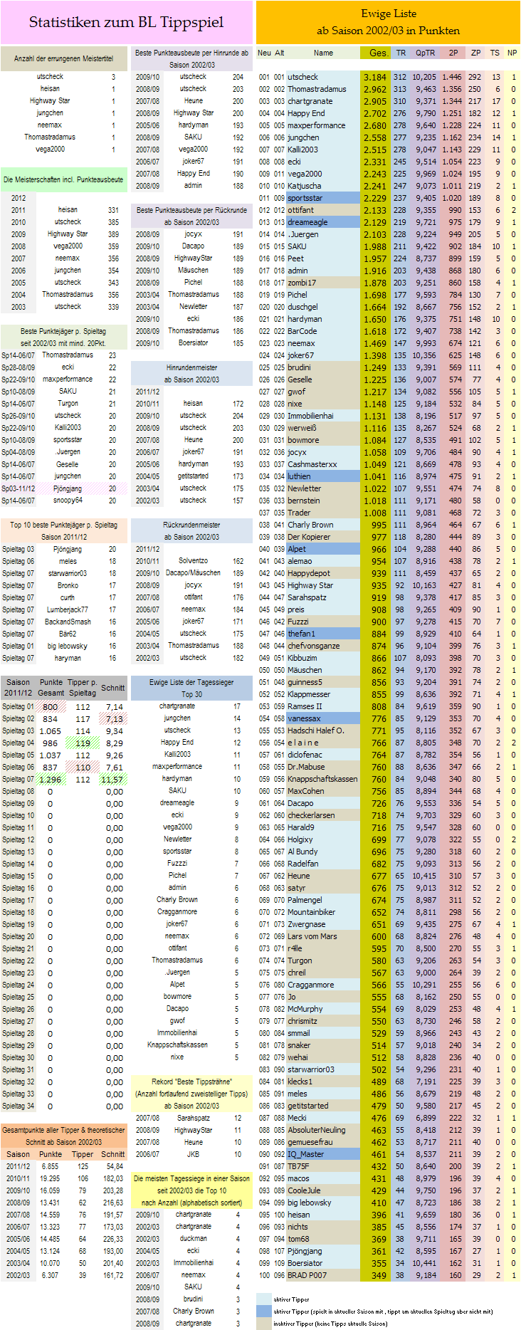 Soviele Punkte wurden diese Saison noch nicht erspielt, wie an diesem 7.Spieltag.. Der Durchschnitt aller Tipper lag weit über 11!!! 112 Tipper waren es wieder... Die Topwertung der Saisonbestleistungen in Sachen Punkte, hat sich nach dem 7.Spieltag nun beträchtlich gefüllt mit Punktständen jenseits 15/16 Punkten.. und in der ewigen Liste fehlen Grinch nur noch 2 Punkte um unter die Top 100 zu kommen..