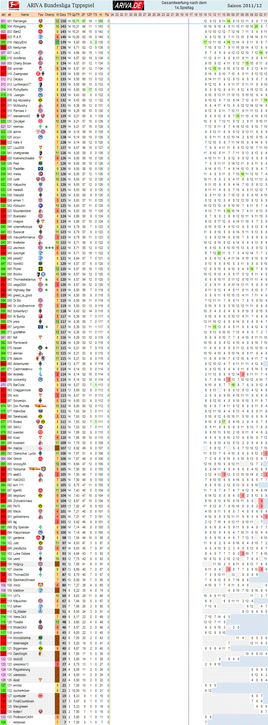 Gesamtübersicht: Gesamtwertung nach dem 14.Spieltag