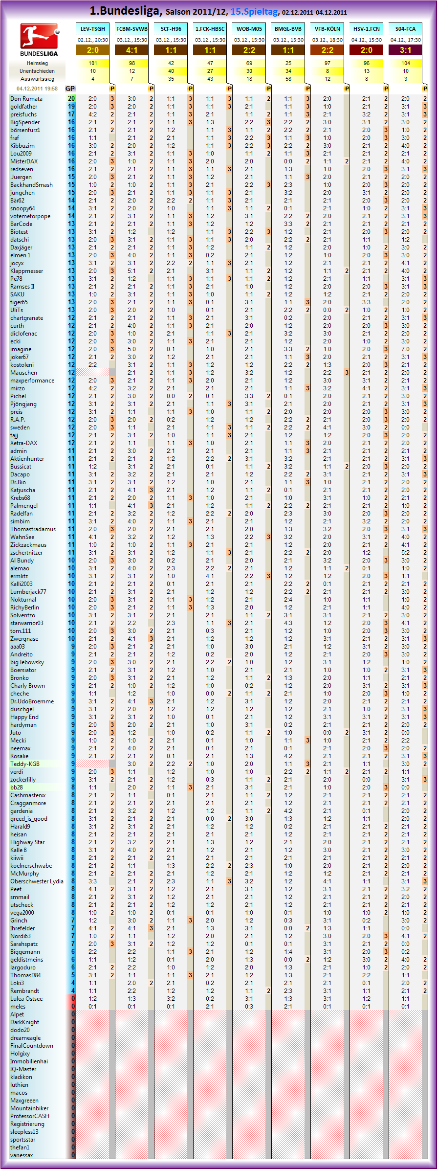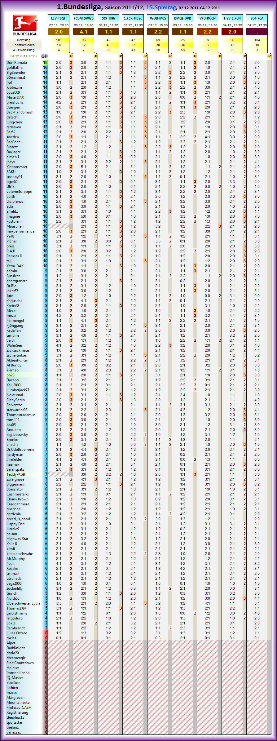 Die Übersicht der Partien des 15.Spieltages der 1.Bundesliga, Saison 2011/12 zum tippen: