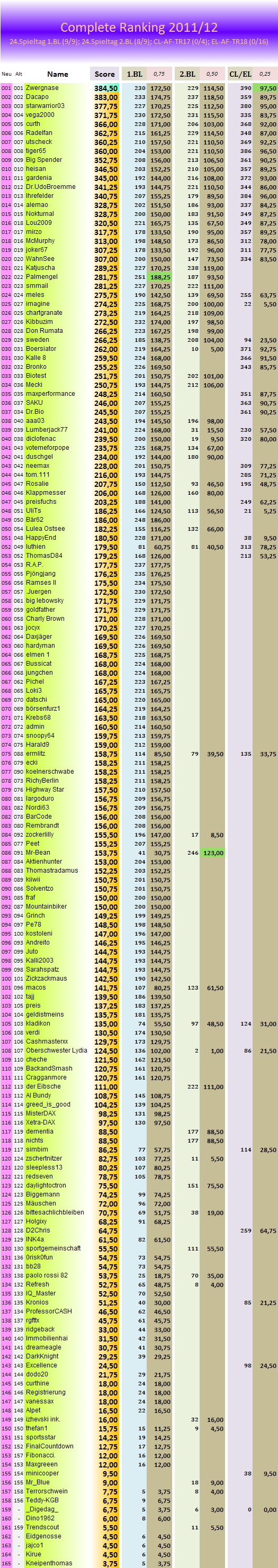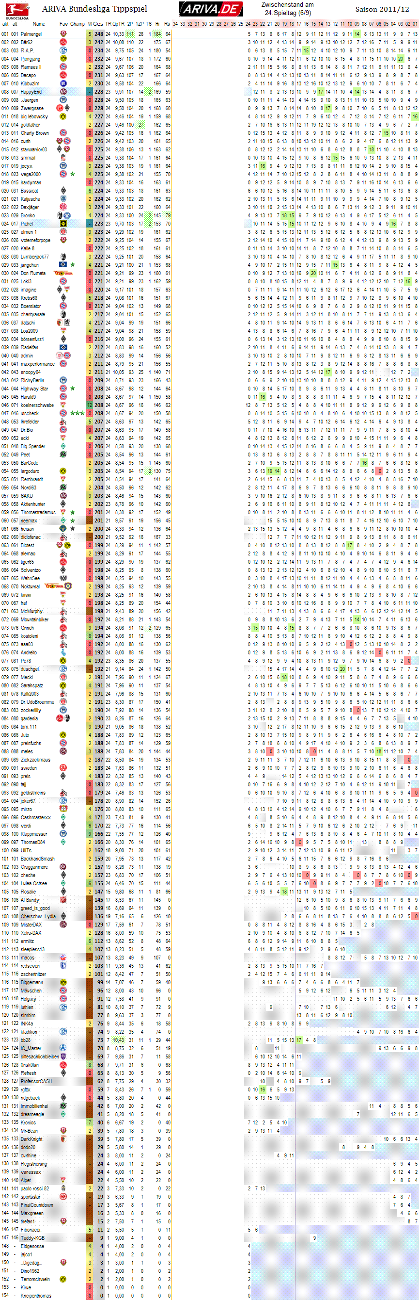 Palmengel hat den besten Schnitt pro Tipprunde.. hat die meisten richtigen Tendenzen, neben Bär62, mit 112.. Palmengel hat gar die meisten Extrapunkte, neben goldfather mit je 27.. und hatte die beste Hinrunde.. Uff..