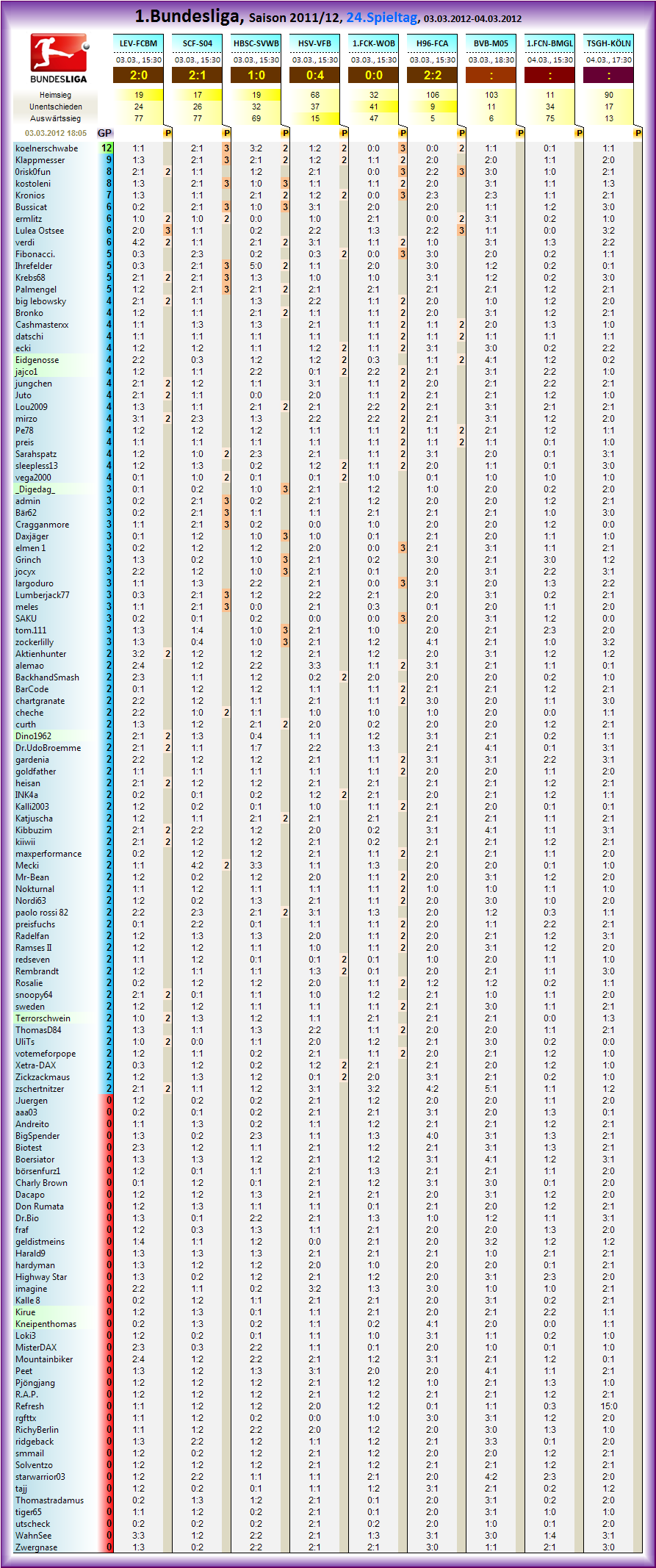 Die Übersicht der Partien des 24.Spieltages der 1.Bundesliga, Saison 2011/12 zum tippen: