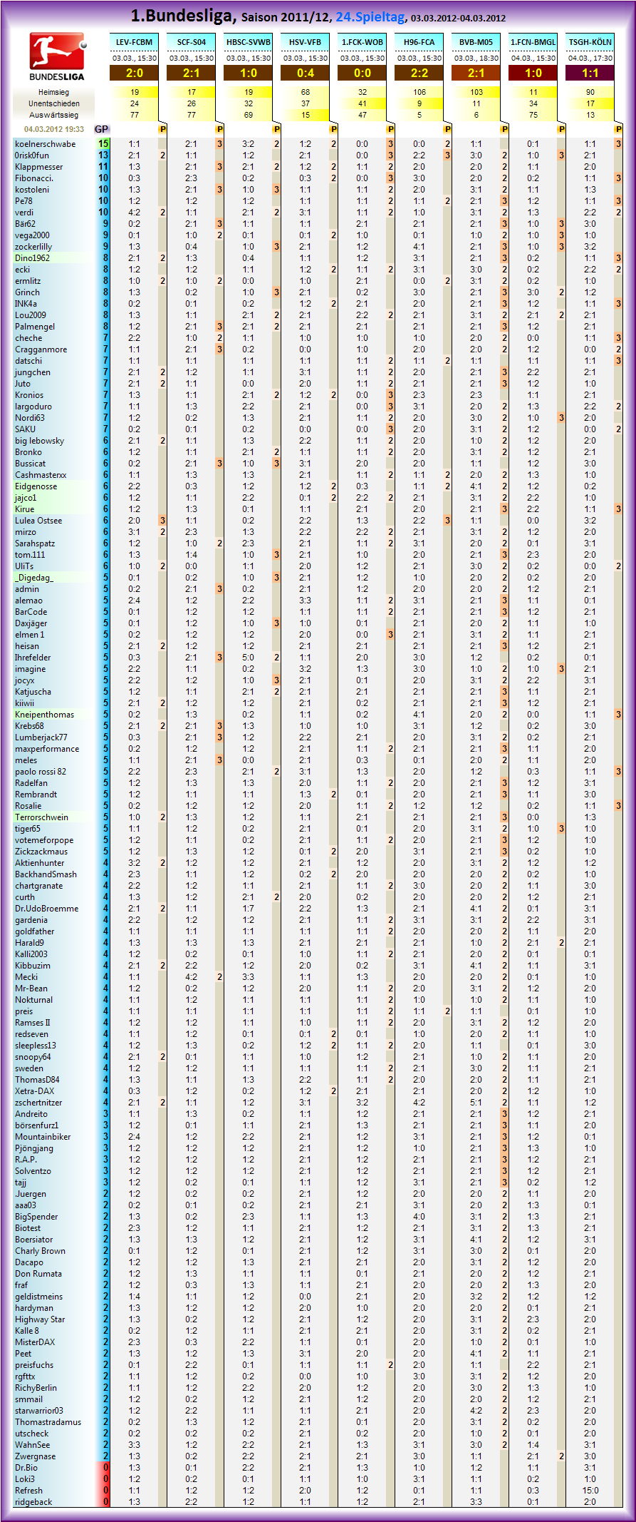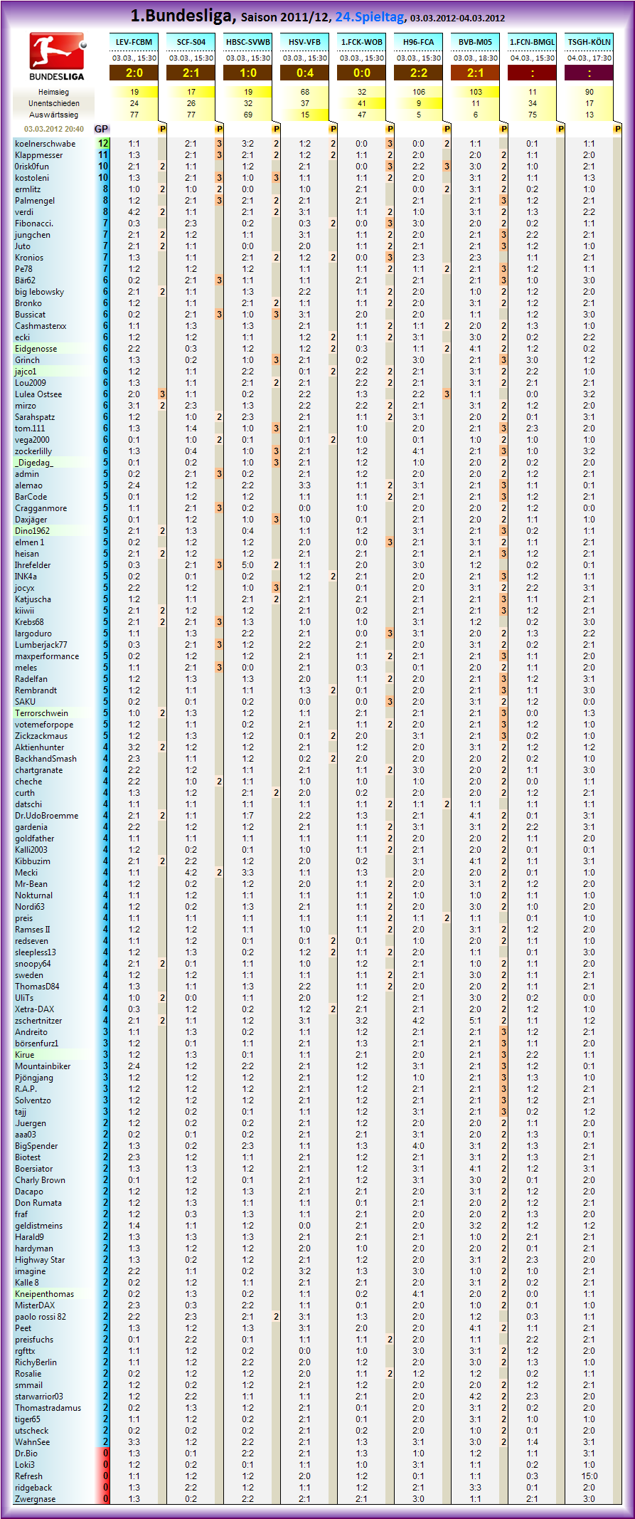 Allgemein war es ein schwacher, sehr schwacher Tipperspieltag, dazu dann mehr im Statistikblock..