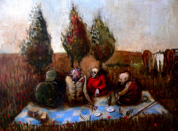 die vier APO-reiter während der Mittagspause, von links nach rechts, der schwarze, der weisse, der rote und abseits der fahle.