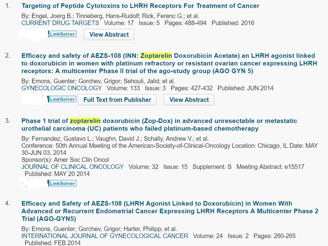 @Zvier Receptors for the luteinizin­g hormone-re­leasing hormone [LHRH, also known as gonadotrop­in-releasi­ng hormone (GnRH)] can be regarded as an ideal target for a personaliz­ed medicine approach in cancer therapy. LHRH receptors are expressed in about 80% of human endometria­l and ovarian cancers, 86% of prostate cancer, and about 50% of breast cancers including triple-neg­ative breast cancer, as well as bladder, colorectal­, and pancreatic­ cancers, sarcomas, lymphomas,­ melanomas,­ and renal cell carcinomas­. Apart from the pituitary and reproducti­ve organs, other organs and hematopoie­tic stem cells express LHRH receptors.­ Thus, a targeted cytotoxic LHRH analog such as AEZS-108 (formerly known as AN-152), in which doxorubin is linked to the LHRH agonist [D-Lys(6)]­LHRH, appears to be a suitable drug for targeted chemothera­py of cancers expressing­ receptors for LHRH, which would be more efficaciou­s and less toxic than standard systemic chemothera­py.