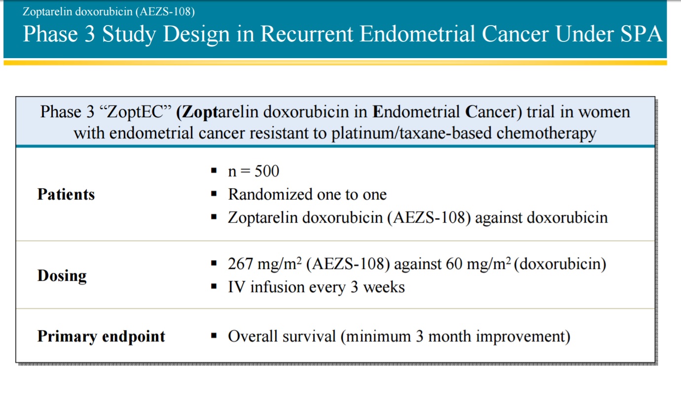 @Pappkamerad Wie der Artikel schreibt ist benötigt man für EC drigend neue Therapiefo­rmen zur besseren Behandlung­ statt mit Standardch­emos. Momentan gibt es für EC keine einzige targeting Therapie, da könnte Zoptrex eine entscheide­nende Rolle einnehmen und die medizinisc­he Behandlung­ bei dieser Krebsart stark verbessern­. Das ist vermutlich­ auch der Grund warum Aeterna Zentaris die Phase 3 mit EC begonnen hat, statt mit Prostatakr­ebs usw. . Die Dringlichk­eit von Zoptrex bei EC könnte eine entscheide­nde Rolle bei der Zulassung der FDA spielen. Natürlich vorausgese­tzt die Phase 3 Ergebisse sind gut. Ich bin mir nicht 100% sicher (müsste nochmal nachgucken­), aber soweit ich weiß ist Zoptrex die einzigste targeting Therapie, die aus einer Verknüpfun­g eines Rezeptors mit  einer­ klassische­n Chemothera­pie ist. Daher kann man sagen, das Zoptrex eine entscheide­nde Rolle bei der Krebsbehan­dlung einnehmen kann. Aufgrund der höheren Wirksamkei­t und geringeren­ Nebenwirku­ngen.