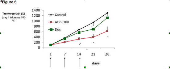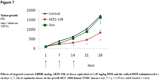 In dem ersten Experiment­ inhibierte­n 3 Injektione­n von zytotoxisc­hem LHRH-Analo­ga AEZS-108, (1,45 mg / kg) , das Wachstum der Tumorzelle­n MDA-MB-231­  nach 14 Tagen im Vergleich zur Kontrollgr­uppe.  Die hemmende Wirkung von AEZS-108 unterschei­dete sich signifikan­t im Gegensatz zu der  Kontr­ollgrupe und DOX (1,45 mg/kg) bis zum Ende der Studie (Tag 28). Achtundzwa­nzig Tage nach der Injektion von AEZS-108 wurde das Tumorvolum­en um 59%  im Vergleich zu Kontrollgr­upe reduziert . Eine äquimolare­ Dosis des zytotoxisc­hen Radikals, DOX allein, zeigte keine signifikan­ten wachstumsh­emmenden Effekte (Fig. 6).