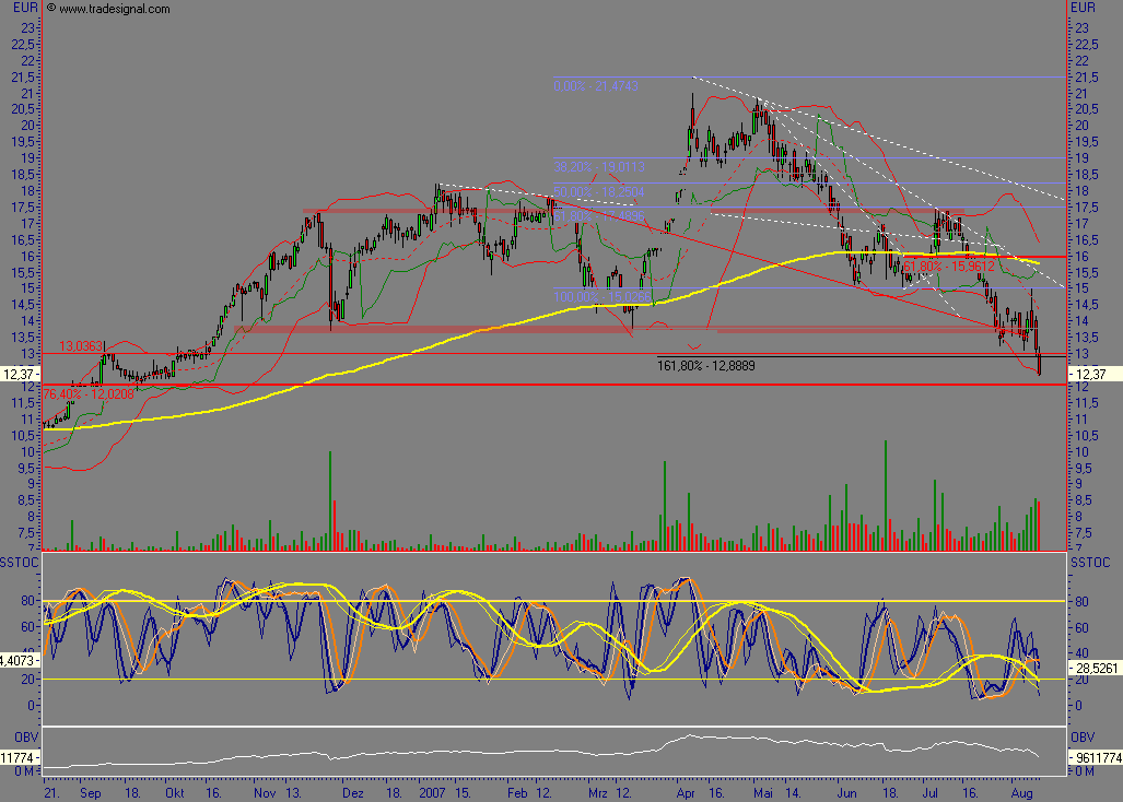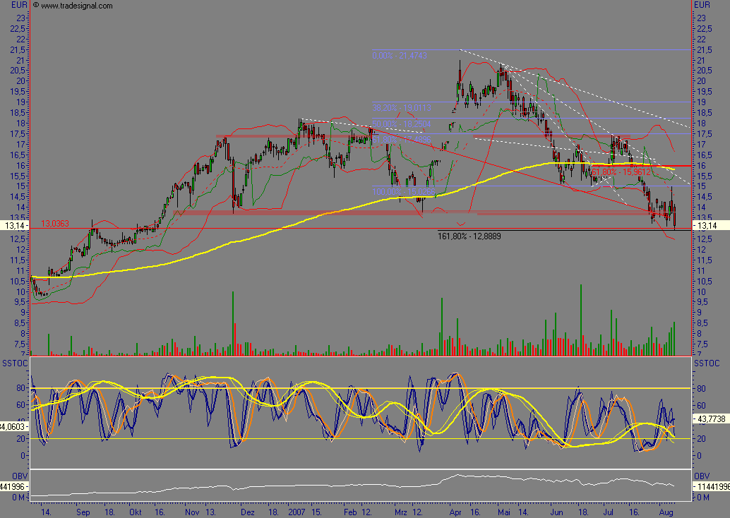 Wie auch die Analysten der Actien-Börse schreiben, sei die Aktie nach unten ausgereizt ! Aber hier haben wohl weder Finanzkrise noch Charttechnik Einfluss, sonder wie man unschwer erkennen kann, gibt es hier einen Drücker, der den Kurs bei 13 Euro halten möchte und seine Stücke grosszügig bei diesem Kurs auf den Markt schmeißt - aber irgendwann geht auch ihm die Puste aus !