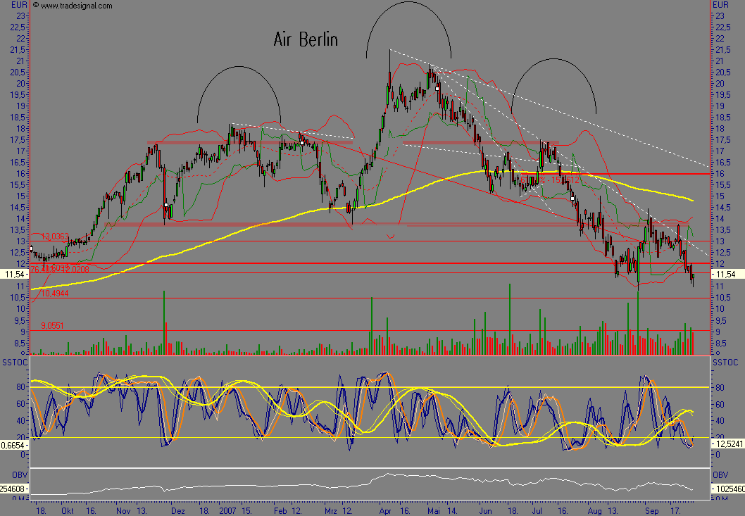 Air -Berlin -Chef Hunold sieht sein Unternehmen derzeit nicht als Übernahmekandidaten,obwohl er es mit einem Börsenwert von unter einer Milliarde Euro als -völlig unterbewertet ansieht.Den Kurs ließ das bisher kalt.Der seit Mai gültige Abwärtstrend bei aktuell 14,50 Euro ist nach wie vor intakt.Wird dieser überwunden,dürfte der Kurs zügig Richtung 18 bis 20 Euro laufen.