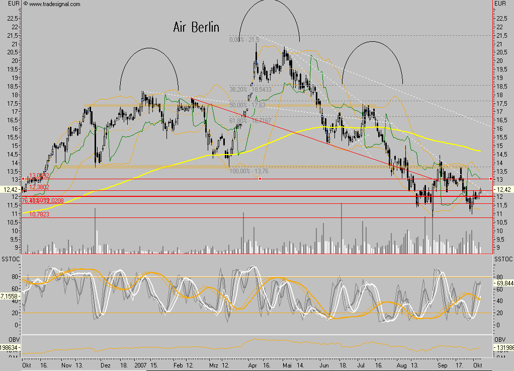 Meine größte Sorge ist, dass sich AirBerlin mit den vielen Übernahmen mehr oder weniger übernimmt. Das ist meiner Meinung nach aber umfassend im Kurs berücksichtigt und die Rücknahme der Prognose hat die Erwartungshaltung an das Unternehmen nochmals reduziert.