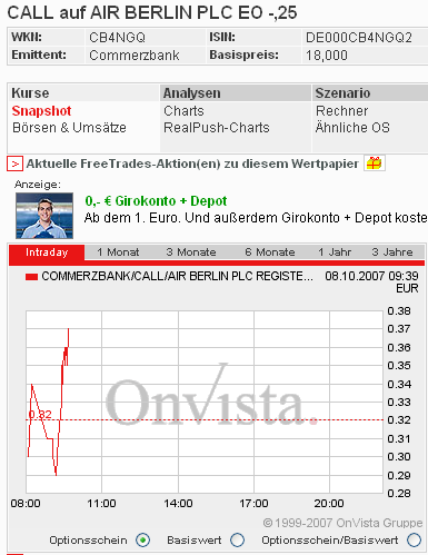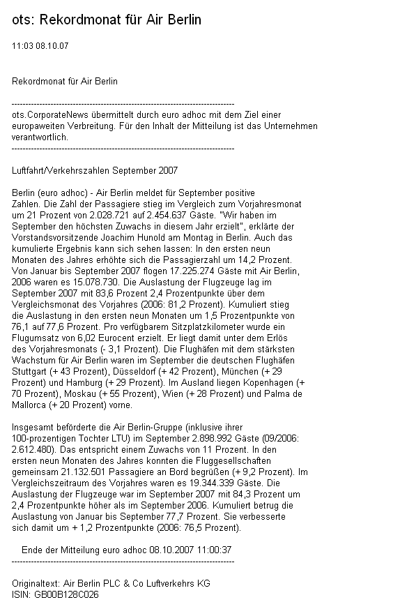 "Die Air Berlin PLC gibt bekannt, dass sie mit der Thomas Cook AG ("Thomas Cook") die Übernahme der Anteile an der Condor Flugdienst GmbH ("Condor") in zwei Schritten durch einen Anteilstausch vereinbart hat: Im Februar 2009 sollen 75,1 Prozent der Anteile an Condor von Thomas Cook und die weiteren 24,9 Prozent der Anteile an der Condor im Februar 2010 übernommen werden, die Thomas Cook im Februar 2009 von der Deutsche Lufthansa AG ("Lufthansa") aufgrund der Ausübung einer Kaufoption erwerben wird. Thomas Cook erhält im Gegenzug für ihre Anteile an der Condor neu auszugebende Aktien der Air Berlin, die zum Zeitpunkt der Durchführung der Vereinbarung – abhängig vom dann aktuellen Börsenkurs – einen Wert zwischen 380 und 475 Millionen Euro darstellen. Thomas Cook wird dabei voraussichtlich eine Beteiligung von bis zu 29,99 Prozent an Air Berlin erhalten." Quelle AirBerlin HP 20.09.07