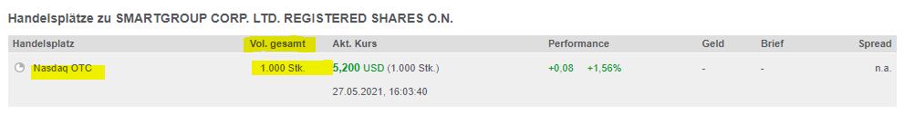 Nachdem ich inzwischen mal etwas genauer nach der Handelbarkeit von Smartgroup geschaut habe, stellte sich heraus, daß seit Mai keine Kurse mehr notiert wurden und auch damals nur 1.000 Stück über den Tisch des Hauses gegangen sind an einem Tag, s. Screenshot (Quelle: Onvista).