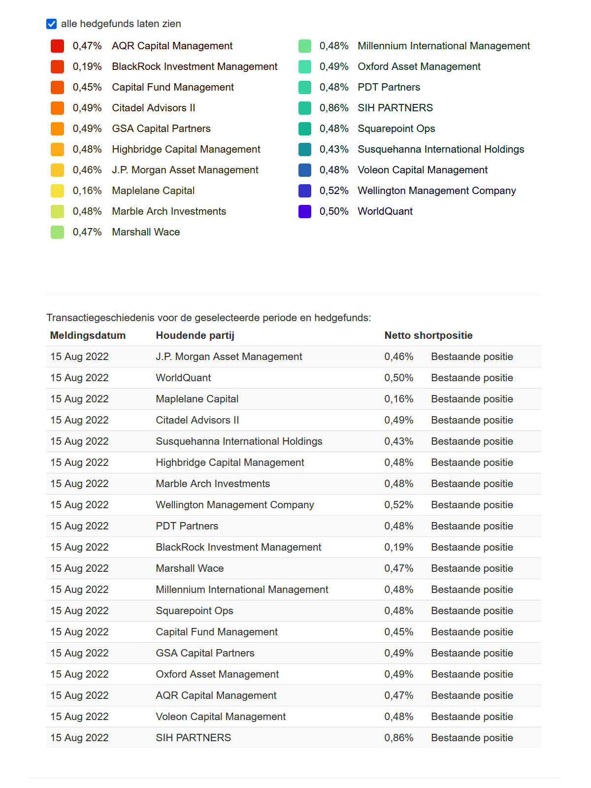 Gesamte Netto-Leerverkaufsposition zum 16. August 2022: 8,86 % (einschließlich der letzten bekannten Position von Parteien, die unter die Meldeschwelle fallen). Bekannte Short-Positionen unter 0,5 % unterliegen nicht mehr der Meldepflicht. Es ist daher nicht bekannt, ob diese Positionen nach der Abschlussmeldung noch bestehen und wie groß sie sind. Die nachstehende Tabelle zeigt sie dennoch.