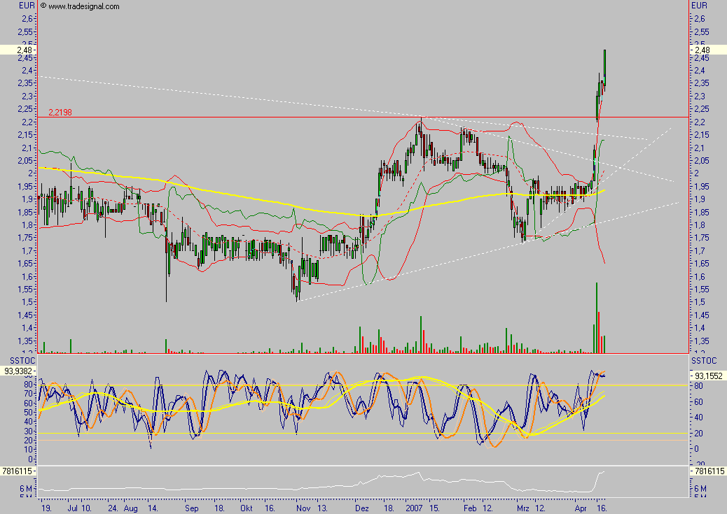 Hab mal, da noch net aktuell, das Chandle und die Umsätze von dieser Woche eingezeichnet. Echt beeindruckend! Ein absoluter Ausbruch, vorallem auch durch den SK über 2,40. Im Linienchart sind die 2,50 voll wichtig, da sie ein harter Widerstand auf Wochen-SK-Basis sind. Diese Marke wird wohl auch die ganze nächste Woche umkämpft sein und gegen WE hoffentlich nachhaltig übersprungen sein. Die 2,70 sind dann ansich nur noch ne Kleinigkeit da nicht besonders markant.