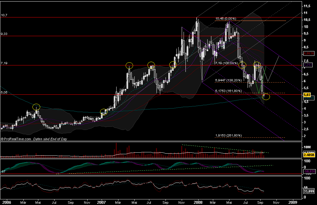 nach wie vor dabei,als alter Aixtron-Fan.Wenn man sich so die letzten Tage mal anschaut,wird gerade an den Börsen schönstes Monopoly gespielt.Eine Bank übernimmt die andere und das für'n Appel und ein Ei.Eine geile Zeit,so was mal mit zu erleben.Endlich fängt die Bankenwelt mal an,ihre selbst verzapfte Finanzkrise aufzuräumen.Eine Bank nach der anderen geht krachen,heute ist die HBOS im Gespräch.Nach dem großen Sell Out gehen wir dann alle gestärkt wieder zum Alltagsgeschäft über.Diese Woche ist großer Verfallstag,danach dürfte dann wieder Normalität einziehen.Der Börsenmonat September macht seinem Namen alle Ehre,der schlechteste im Jahr zu sein,hat aber auch was gutes an sich gehabt,wir haben noch mal Kaufkurse gesehen.