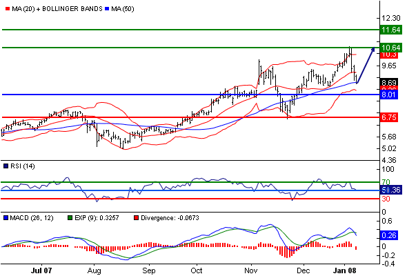 Unterstützung: 7.21 / 8.01 / 8.32 Widerstand: 10.14 / 10.64 / 11.13