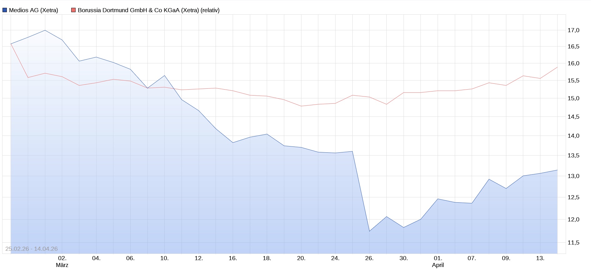 Hier sieht man die extrem unterschiedliche Kursperformance beider Aktien nach der Gewinnwarnung von BVB am 26.2. Die extrem enttäuschte Reaktion der Märkte auf die Zahlen von Medios am 26.3. ist da auch enthalten.