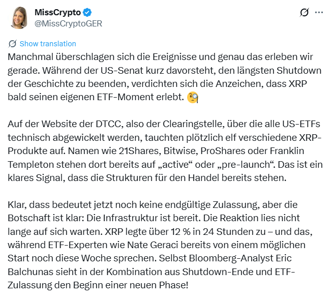 Manchmal überschlagen sich die Ereignisse und genau das erleben wir gerade. Während der US-Senat kurz davorsteht, den längsten Shutdown der Geschichte zu beenden, verdichten sich die Anzeichen, dass XRP bald seinen eigenen ETF-Moment erlebt.