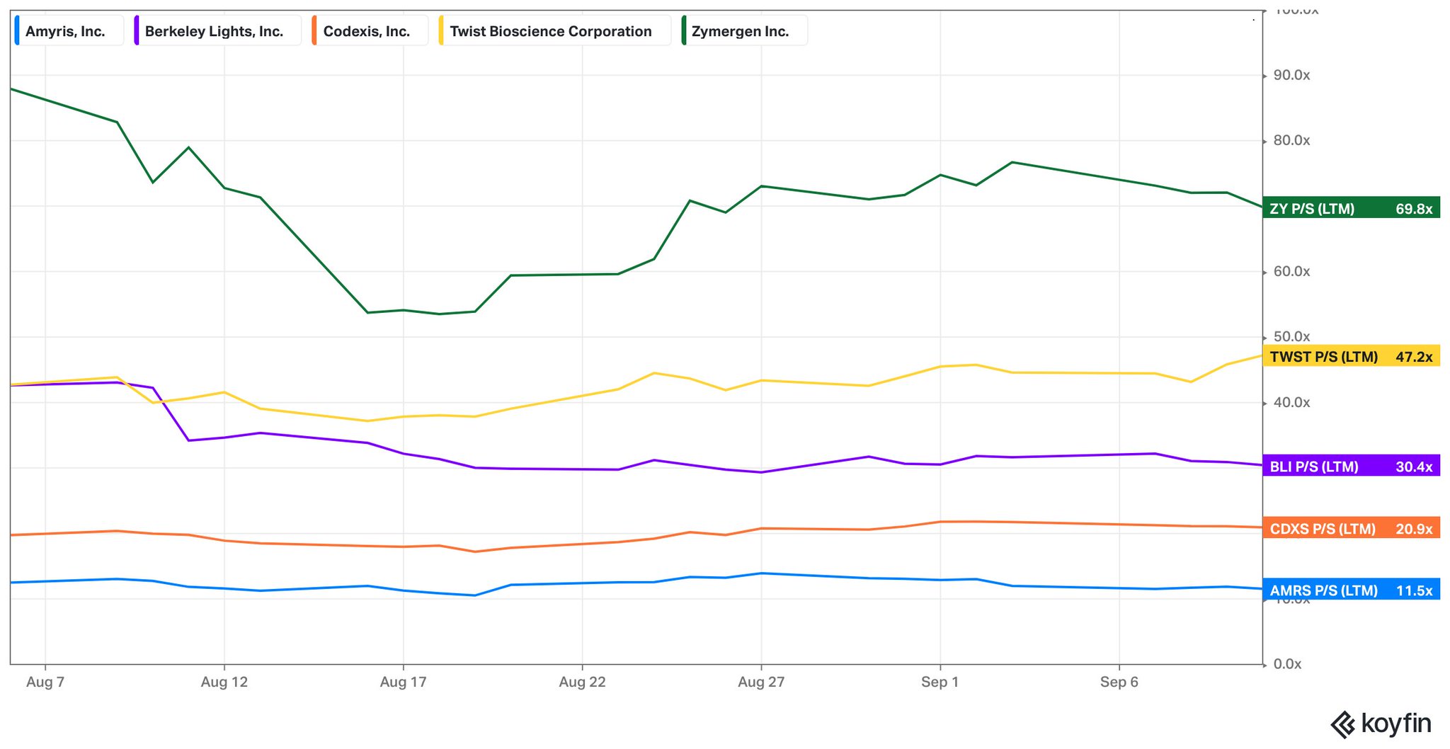 Ich hab hier ein tolles Schaubild gefunden wie Amyris im Vergleich zur Peer Group bewertet ist. Unfassbar das Zymergen mit dem 6 fachen bewertet wird. Ich denke wenn das Managment am Ball bleibt und weiterhin gute Arbeit liefert holen wir früher oder später auf. Ich hoffe es zumindest!