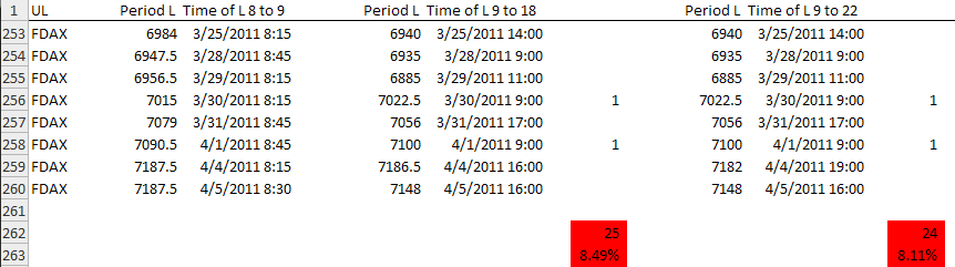 Wie du unten anhand des FDAXes (zwischen 08 und 09 ist auch Börse) über einen Zeitraum von einem Jahr Intraday sehen kannst, wurde das 08-09 Low nur in 8% der Fälle im Verlauf der restlichen jeweiligen Perioden nicht mehr erreicht oder unterschritten. Der Prozentsatz der Zeitpunkte (Tage des Jahres) an dem das Hoch für den Zeitraum nach 9:00 Uhr (bis 18 Uhr oder 22 Uhr) vor dem Tief nach 9:00 (bis 18 Uhr oder 22 Uhr) erreicht wurde, beträgt 50%. Das restl. Drumherum machst du (ich hab's schon). Geht schnell.