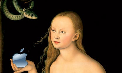 Selbst wer nur oberflächlich durch den Apple-Kosmos wandert, stößt auf eine derartige Flut religiöser und pseudo-religiöser Symbolik, dass er sich am Ende erleuchtet die Augen reibt. Das beginnt beim Firmennamen und dem Logo, einem angebissenen Apfel, der Assoziationen an den Baum der Erkenntnis im Garten Eden weckt. Aus dem Paradies vertrieben wurde durch diesen Apfel niemand, im Gegenteil: Nach Auffassung der Apple-Jünger haben damit paradiesische Züge in die sperrige Computer-Welt Einzug gehalten: Maschinen, die menschliche Eigenschaften haben, die so funktionieren, wie man es will, und immer stärker zum Begleiter, ja für manche gar zum Freund geworden sind.