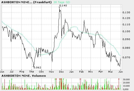 es wird erstmal nicht viel praktisches laufen, mit ashborton. es besteht zwar ein potential zur verzwölffachung, wie man anzumerken weiss, aber dass ist auch schon alles. goldpreis ist zu niedrig, ölpreis zu hoch, um in australien anzufangen. und jetzt haben sie die mine in brasilien eingeheimst, um noch mal ein bisschen phantasie aufkommen zu lassen. stellt sich die frage: wer würde eine solche für 93.000 euro verkaufen, wenn klar waere, dass da noch mehrere millionen rauszuholen waeren?