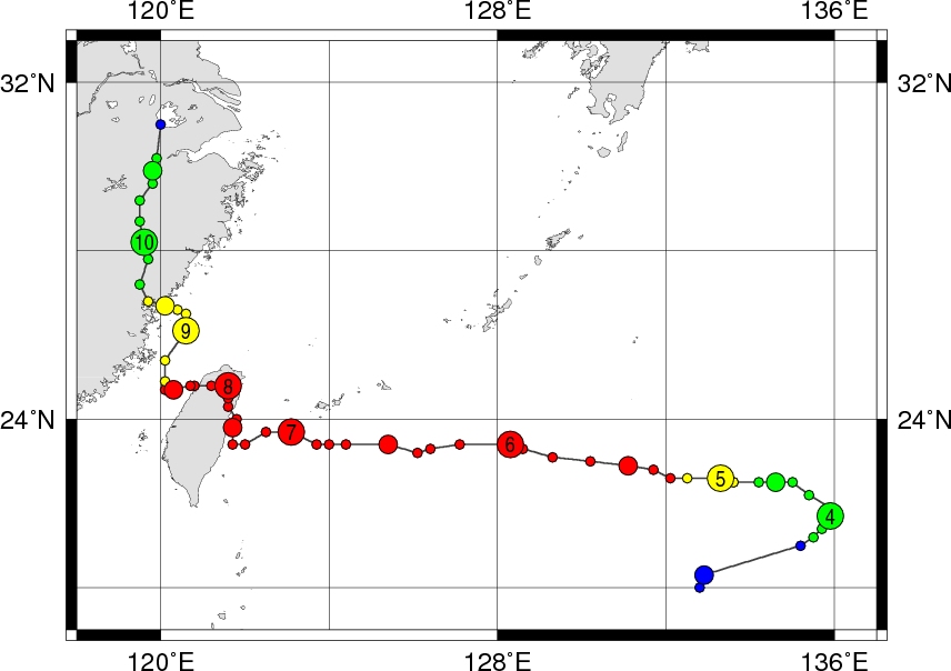 Allerdings liegt Taiwan vor China. Die Insel hat, wie so oft, einen Bremseffekt auf Taifune. Als der Taifun Morakot das Festland China erreichte war er kein richtiger Cat 5 Taifun mehr eher ein Cat 4. mit ca. 100 KM/h Wind statt über 140 KM/h auf dem offen Meer.