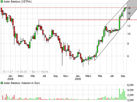 Insofern ist auch die Frage, wo der Kurs in den nächsten paar Wochen möglicherweise konsolidiert, mir auch egal. Gewinnmitnahmen wird es immer mal geben. Wichtig ist, dass die Prognosen des Vorstands auch bei den nächsten Quartalsberichten eingehalten werden. Wenn das gelingt, steigt weiter das Vertrauen in das Management und dann wird man Asian Bamboo auch relativ schnell KGVs von zumindest 10 zugestehen. Das würde bereits für 2009 ja einem Kurs von 22-27 € entsprechen, wobei da Sonderfaktoren enthalten sind. 2010 rechne ich mit einem EPS von 2,7-3,0 €. Daher auch mein Kursziel von 30-35 € bis Anfang 2011.