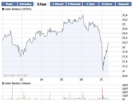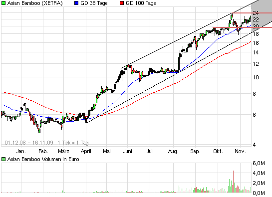 Bis spätestens Ende 2010 soll die Gesamtfläche der Plantagen auf gut 40.000 Hektar steigen. „Weil es eine starke Korrelation zwischen Umsatz, Gewinn und Fläche gibt, ist also auch künftig mit Wachstum zu rechnen“, fügte Sjovall hinzu. Die Dividende für 2009 in Höhe von 30 Cents wird die Anleger wohl freuen. Noch mehr freut sich aber wohl der Gründer und Chef der Asian Bamboo AG Lin Zuojun, dem immerhin 48 Prozent der Anteile gehören.