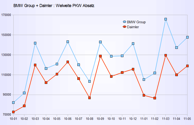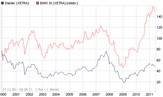 Wenn ich mir Daimler und BMW kurs vergleiche sieht man sofort das Daimler sehr weit hinten bzw. tieferen Kursstand hat.