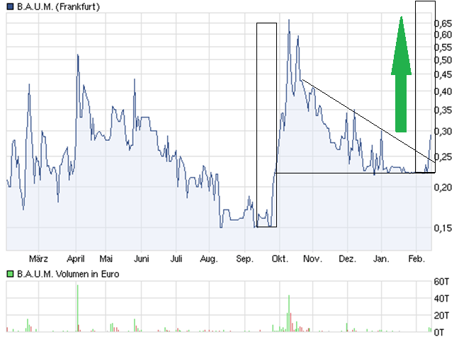 Im BID wurden immer wieder Stücke eingestellt - und der Schlusskurs von 0,29€ bestätigt den Trend. Beim letzten Run dieser Art ging es 0,50 € auf Schlusskursebene nach oben, setzt man diesen Punkt auf den aktuellen Anstieg an können Kurse von 0,75€ durchaus wieder ein Fokuspunkt sein. Seit Wochen erhalte ich keine Informationen der Kanzlei, welche mit B.A.U.M. beschäftigt ist - lässt Raum für Spekulationen eventuell haben sie ja etwas zu "verheimlichen".