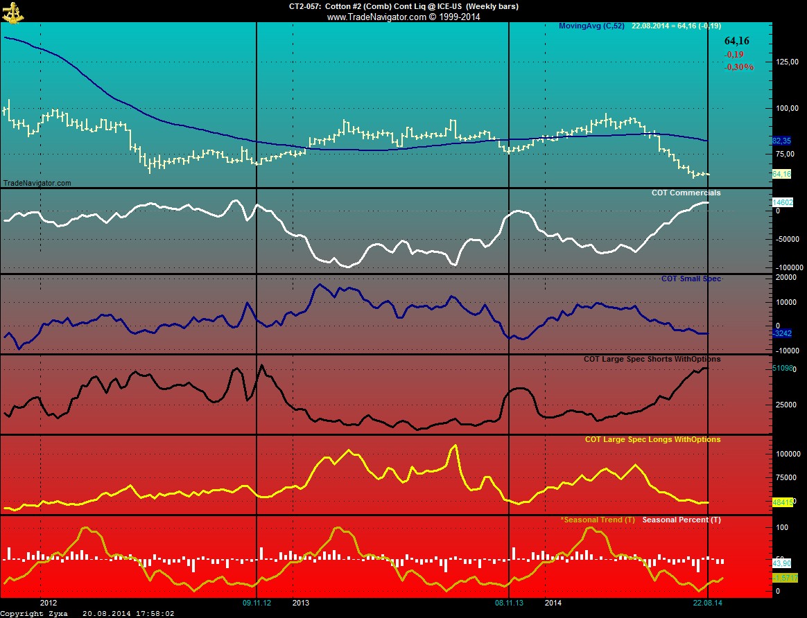 seit fünf monaten pendelt der kurs zwischen 60 und 70. gemäss 37jahres cotton futures chart wäre jetzt der kaufpunkt, wie zyxa schon erwähnt hat. dagegen sprechen die übervollen lagerbestände, wo insbesondere bei den chinesischen befürchtet wird, dass diese reduziert werden könnten. china ist mit staatlichen mindestpreisen für die einheimische produktion auch hauptsächlich schuld am überangebot und verhindert damit eine gesunde reduktion im sinne eines "schweinezyklus". irgendwie erinnert mich die situation an den zuckerpreis, der kurs krebst seit monaten um den herstellungspreis. meine longposition lasse ich laufen, rechne aber nicht mit einer grossen veränderung in nächster zeit - ausser irgendwo auf der welt wird aus meteorologischen oder klimatischen gründen eine ernte stark dezimiert. erntezeit auf der nordhalbkugel, wo die grossen anbaugebiete liegen, ist oktober bis februar.