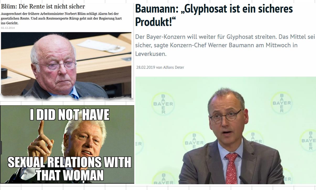 ich stelle Baumann hier neben einen Lügner (Clinton), dem ich übrigens seine Lüge nicht übel nachtrage, und neben Norbert Blüm, der nicht lügt, aber dessen Aussage kritisch hinterfragt werden muss. Ja, die Rente ist, sicher. Es ist aber nicht sicher, ab wann (Renteneintrittsalter) wir heute noch Arbeitenden beziehen werden und in welcher Höhe - deshalb ja auch private Altersvorsorge. Sicher in Bezug auf Glyphosat ist, dass es den Tod für damit behandelte Pflanzen bringt - Unkraut-EX. Der Link zu der Doku auf Youtube führt zu einer sehr kritischen Studie. Natürlich kann ich deren Wahrheitsgehalt nicht prüfen, aber zumindest sind negative Wirkungen von Glyphosat glaubhaft dargelegt.
