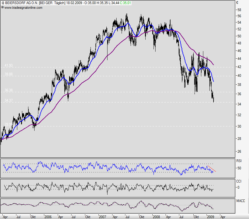 Was Beiersdorf angeht, so ist p&f charttechnisch eine klare Abwärtsbewegung intakt. Seit Anfang Februar 2009 gab es ein "bestätigtes einfaches Baisse-Signal", das nach wie vor Gültigkeit hat. Ein Trendwechsel ist derzeit nicht feststellbar. Ob fundamental begründet oder nicht, spielt derzeit keine Rolle. Die Abwärtsbewegung und damit der Verkauf des Titels ist vorherrschend. Eine Trendumkehrs derzeit jedenfalls noch nicht in Sicht.