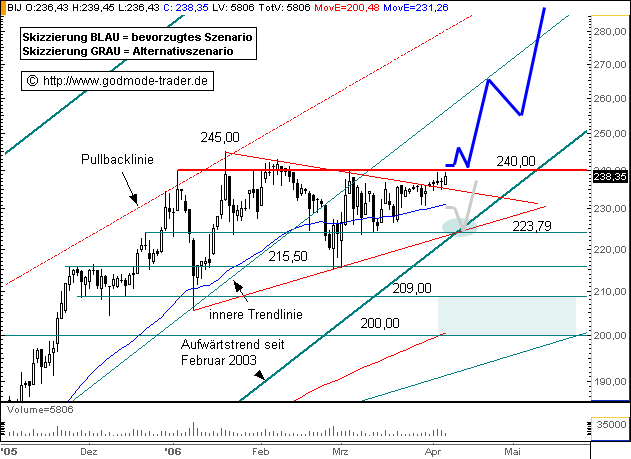 Rückblick: Die BIJOU BRIGITTE Aktie befindet sich in einer langfristigen Aufwärtsbewegung und markierte im Januar 2006 ein neues AllTimeHigh bei 245,00 Euro. Es folgte eine Korrekturbewegung auf hohem Niveau, welche zum Rückfall unter die innere Trendlinie im Februar führte. Die 240,00 Euro Marke hat sich im Laufe der Korrketurbewegung als signifikanter Widerstand gezeigt. Aktuell attackiert die Aktie erneut die 240,00 Euro Marke als kurzfristigen BUY Trigger.