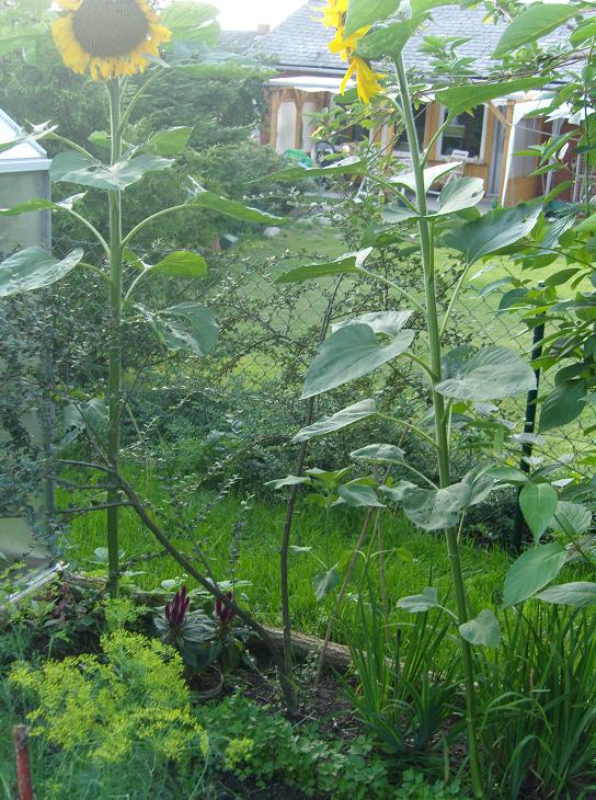 Im Frühjahr hab ich vom lieben Nachbar insgesamt drei davon bekommen. Im Mai ausgepflanzt. In derselben Nacht hat irgendein Feind den Kopf von der Sonnenblume in der Mitte abgekaut. Und so stand sie ohne Kopf, starb nicht und wuchs auch nicht. So ein Stift, ca. 15 cm groß und nur zwei Babyblätter an den Seiten. So ging es monatelang bis sie eines Tages die Entscheidung getroffen doch zu wachsen und hat zwei Triebe aus den Hüften gezaubert.