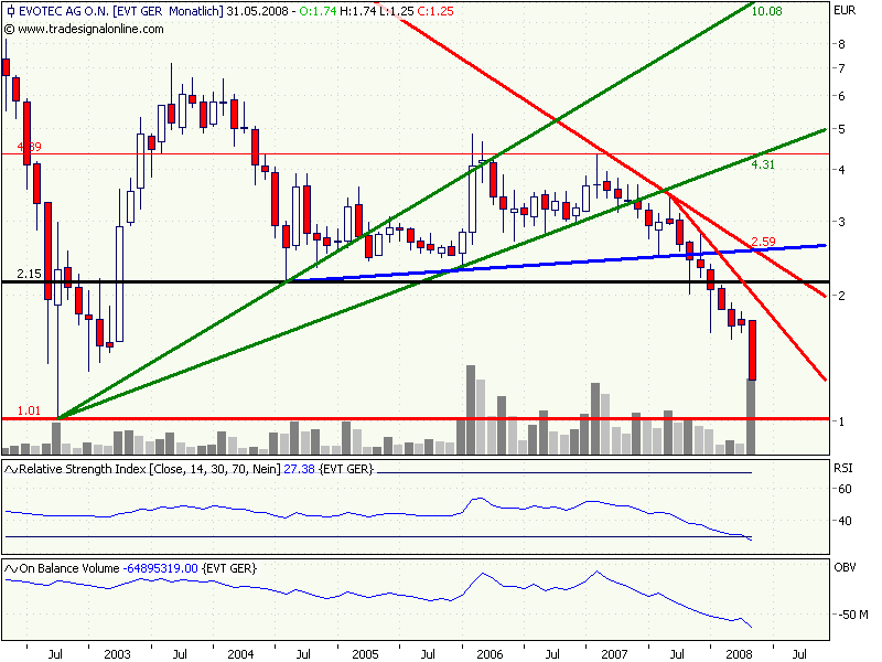 Evotec hat einen starken und massiven Downtrend. Im Mai einen weiteren heftigen Einbruch unter allermassivstem Volumen.