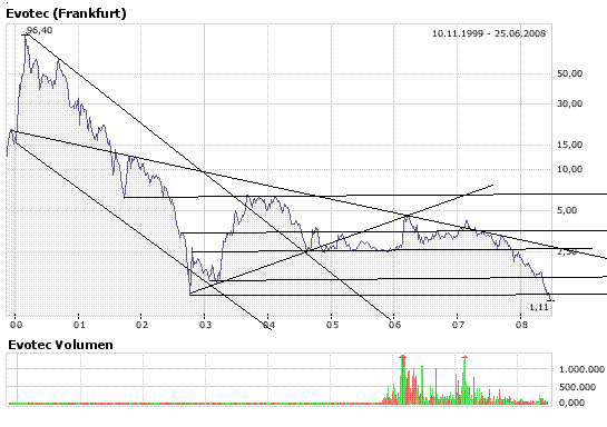 Ich wünsche allen Evotec-Investierten (zu denen ich mit sehr wenigen Aktien auch noch gehöre) viel Glück. Für mich hat sich die Gesellschaft fehlfokussiert auf Medikamente für eher psychologische Fälle. Aldag selbst verwendet im Fall des Raucherentwöhnungsmedikamentes Begriffe wie "Belohnungssystem".... Derartige Medikamente am Markt eines Tages durchzusetzen, traue ich sowieso eher den großen Playern zu. Dazu bedarf es vor allem einer guten Werbeabteilung und guter Vernetzung mit Apotheken und Ärzten. Bei kleinen Firmen bewertet die Börse wohl nicht ohne Grund Firmen mit einer Krebspipeline höher.