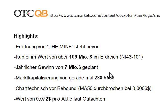 Das Unternehmen plant Jährlich ca. 5,400,000 pounds of Copper Cathode zu fördern.