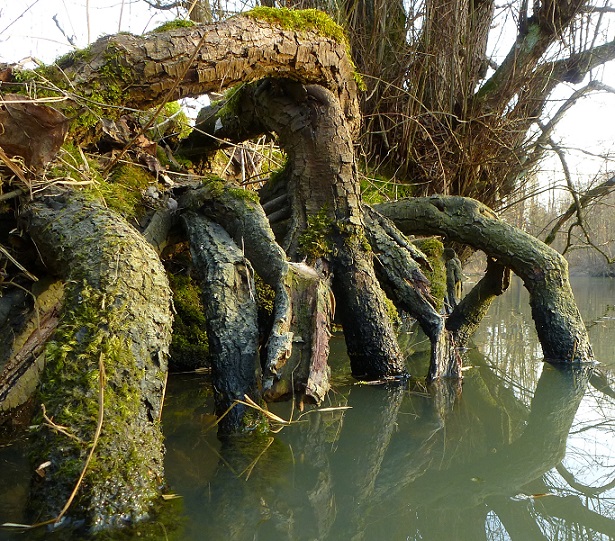 in einen alten hohlen Baumstamm/Weide und über mir