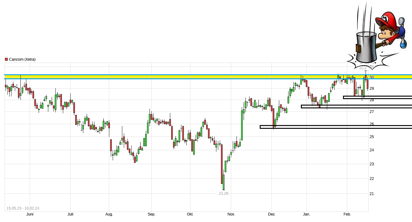 Die jüngst gemeldeten Zahlen für 2023 waren nicht so wirklich berauschend. War aber auch wenig überraschend nach den jüngst schon gehörten Bechtle Zahlen. In einem Umfeld von hoher Inflation und hohen Zinsen sind viele Konsumenten/Kunden eben zurückhaltender bzw. verschieben Ausgaben in die Zukunft. Sollte der Trend sich wieder umkehren, d.h. die Zinsen und die Inflation wieder sinken, dann könnte das die Nachfrage wieder erhöhen, zumal dann auch einiges an verschobenden Investitionen aus der Vorzeit noch helfend hinzukommen könnte. Allgemein geht man ja davon aus, daß dieses Jahr mehrere Zinsschritte nach unten erfolgen werden und die Inflation ihren Höhepunkt klar überschritten hat. Von daher sollte eigentlich auch Cancom ab der 2.Jahreshälfte von diesen möglichen Umständen wieder profitieren. Es wäre daher durchaus verständlich, wenn das Management jetzt erstmal konservativ die 24er Prognose gemacht hat, da eben noch nicht wirklich klar ist, wann diese Senkungen genau anfangen werden. Aber ich denke die wollen sich so vielleicht auch etwas potentielle Luft lassen, um z.B. nach den Hj1. Zahlen dann vielleicht sogar die Prognose nach oben etwas anzupassen. Aktuell kämpft man im Chart mit der Widerstandsregion um 30€. Man ist im Moment etwas darüber. Wäre gut wenn das auch auf Schlusskursbasis so bleiben könnte. Sollte es wirklich diese Tendenz Richtung 2. Jahreshälfte geben, dann wäre für mich auch gut vorstellbar wieder Regionen im Bereich 35-36€ anzulaufen.
