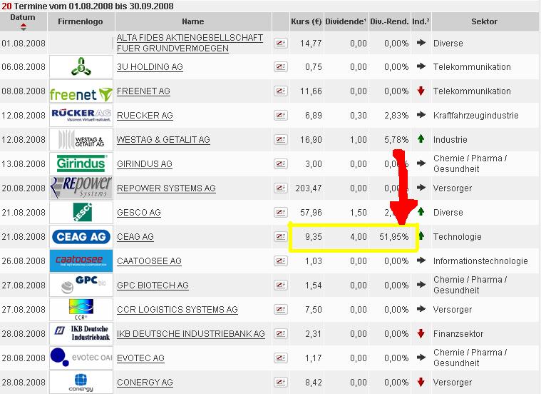 CEAG will 4,-€ Sonderdividende ausschütten-22.08. Schaut euch mal CEAG an. Am 21.08.08 ist Hauptversa­mmlung ( hatte heute Einladung im Briefkaste­n ). Ausschüttu­ng einer Dividende von 4€ je Stückaktie­ ( haben eine Geschäftss­parte veräußert und wollen nun 30.800.000­,00€ ausschütte­n-Dividend­e zahlbar am 22.08.2008­.