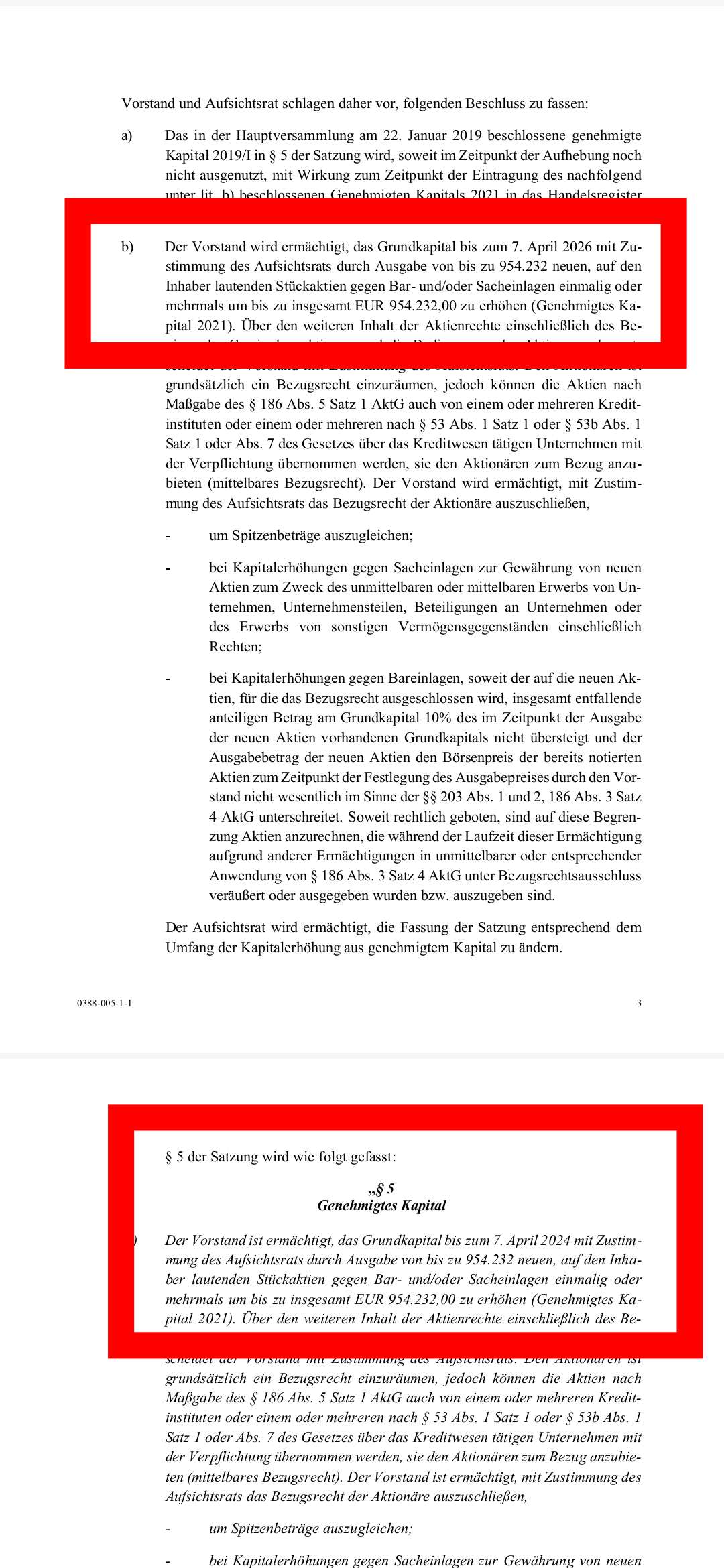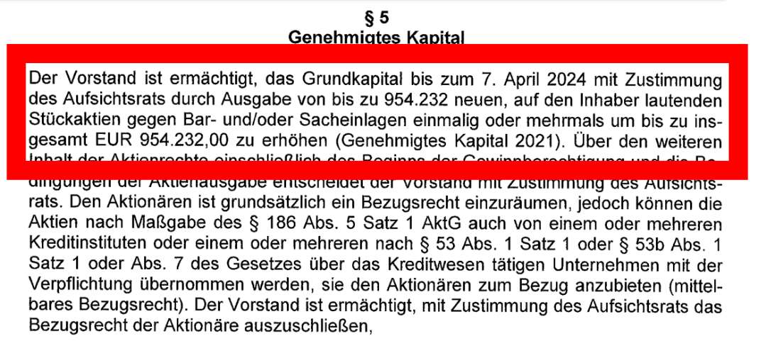 der Einladung der HV 2021 einen Fehler gemacht. Die Ermächtigung, das Kapitel zu erhöhen, sollte wie üblich 5 Jahre, mithin bis zum 07.04.2026 gelten. Bei der Eintragung hat man im Einladungstext statt dem 07.04.2026 wohl irrtümlich den 07.04.2024 geschrieben, so dass dieser Passus auch vom Notar in die Satzung übernommen wurde...