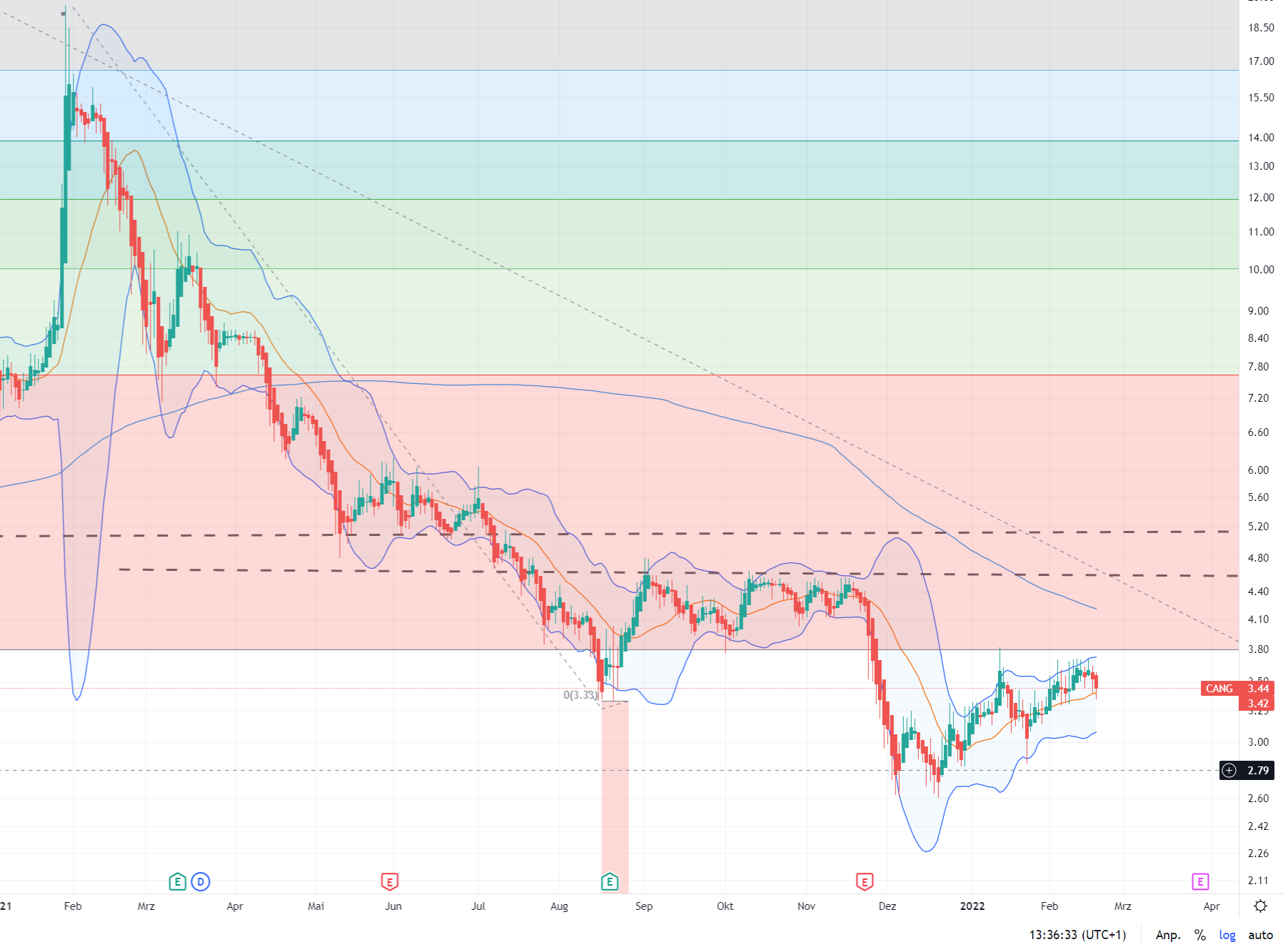 Der Kurs muss die Bollinger Mitte noch um rd. 11 % anheben, um wieder in das altes Retrace zurückzukommen,