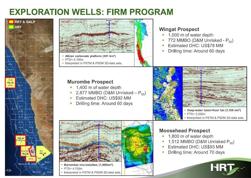 April - results of HRT wingat prospect, looking for confirmation of oil source rocks, and reservoir is expected to be a carbonate reef, so no direct impact on nearby acreage which is targeting turbidite reservoirs. However, an oil flow would dramatically change the sentiment for oil exploration in Namibia.