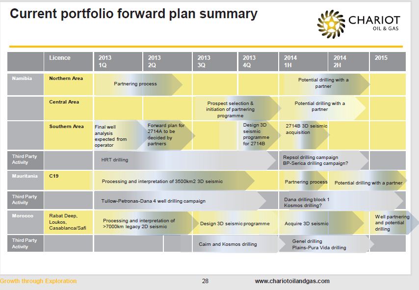 The updated CPR and resource report will assess the 3D seismic, this was issued at the time the data room for the block opened in February. Chariot have said they are looking to farm out a portion of its position in exchange for a fully carried well. The plan is to drill a well on this block early 2014, potentially utilising a rig that at this point would be coming off the back of a 4 well drilling programme planned by HRT on its Namibian licences.