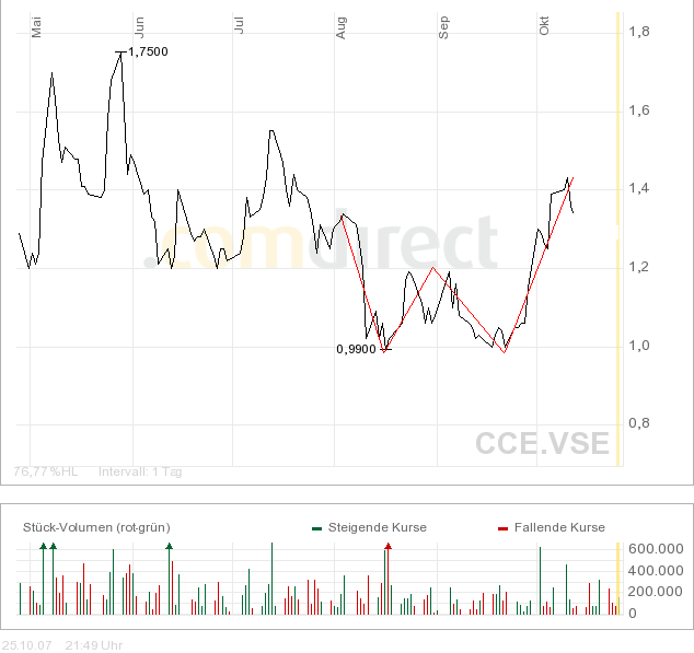 Also 9% gen Norden sind ja ganz nett, aber reißen mich noch nicht vom Hocker. Ich bin hier auch investiert, nur denke ich das ihr hier im Augenblick alles etwas zu rosig seht. Sicherlich sprechen die Fakten bei CCE für sich, nur wird es einfach zu viele Leuchtchen geben die Gewinne mitnehmen, und das bremst den Weg nach oben doch ungemein. Warten wir mal was Kanada macht.