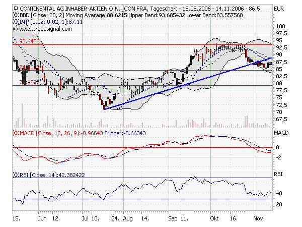 Fakt ist, daß der Wert seinen mittelfristigen Aufwärtstrend (blau) nach unten verlassen hat und jetzt an einer Unterstützung bei 84,50 klebt. Auch die Volumina sind im Moment nicht extrem hoch.