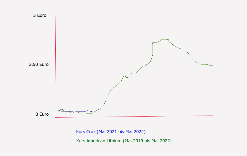 Die Schwierigkeit ist, dass der Chart von American Lithium ganz anders skaliert (von wenigen Cent bis auf 4 Euro) und der von Cruz von wenigen Cent bis 25 Cent.